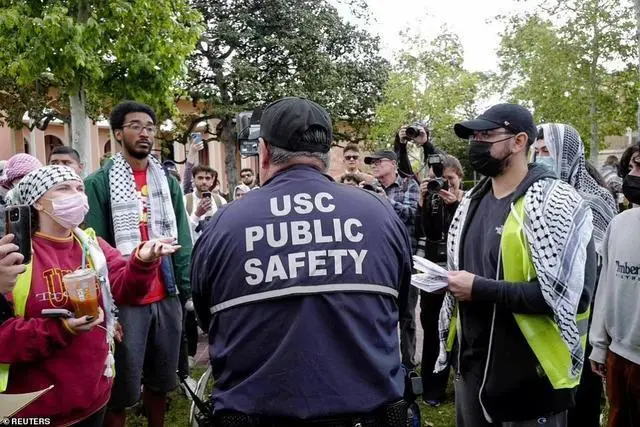 這是南加州大學中的場景,警方代表正在通知參與活動的人,要求他們必須在當地時間4月25日解散。