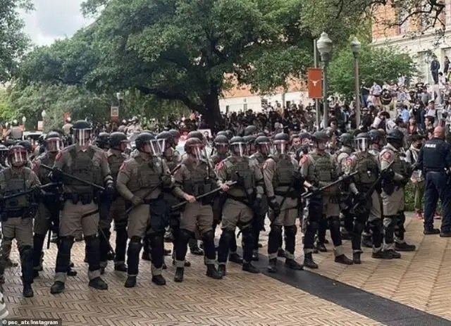這是社交媒體上出現的畫面,據悉有上百名防暴警察出動,他們戴着鋼盔手持警棍出現在校園中。按照美國媒體的説法,如此大規模的警力出動,在其他州是少有的,為此也出現了“別惹德克薩斯!”的標題。