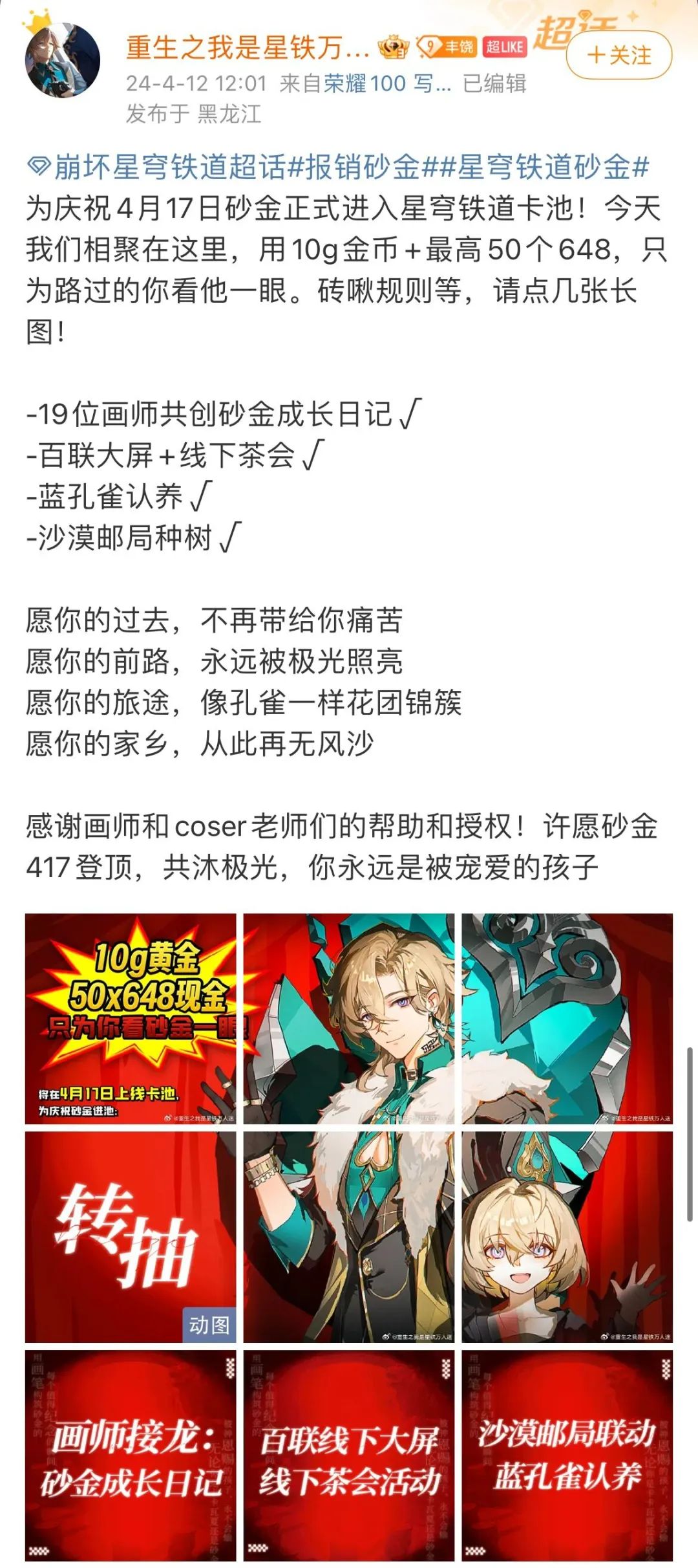 粉絲還不只會為官方的角色卡池、衍生品買單。砂金進入遊戲池的前一週,粉絲們就給予了互聯網不小的二次元廚力震撼。微博用户“重生之我是星鐵萬人迷”在微博發佈了一條轉發抽獎活動,獎池最高達10g金幣+ 50個648元,同時還公佈了幾大應援活動。