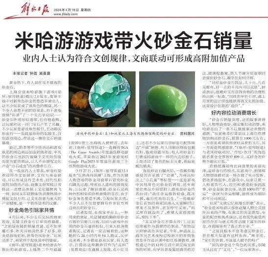 4月18日,解放日報發表了一篇文章《米哈遊遊戲帶火砂金石銷量》。文中指出,由於《崩壞:星穹鐵道》新版本角色砂金塑造豐滿、引發玩家共情,近期東陵玉(學名:砂金石)訂單量暴漲,並表示:“平凡的砂金石也因為被賦予文化附加值而變為緊俏商品,讓人不由感嘆文化產業‘點石成金’的消費牽引力。”