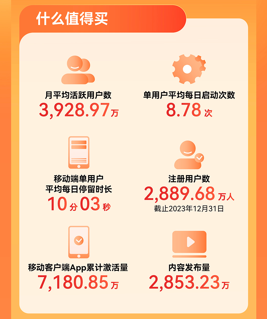 數據顯示,“什麼值得買”月平均活躍用户數為3,928.97萬人,同比增長1.02%。截止2023年底,“什麼值得買”註冊用户數達2,889.68萬,同比增長9.50%;移動端App激活量為7,180.85萬,同比增長11.53%。