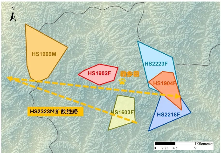 順着豹鄉田第一家庭的脈絡,不難發現這條血脈上的成員幾乎橫貫鐵橋山-八縛嶺棲息地東西兩端,哪怕我們只想保護這一個家庭,都會串聯出一整片的棲息地。如果上北社的主樑不再聯通了,M16就去不了八縛嶺,如果山團線變成了高速公路,平平和夜夜就找不到現在的家園。