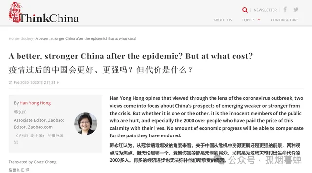 2020年2月,新加坡智庫“思想中國”,《疫情過後的中國或許會變得更好、更強,但代價是什麼?》(A better, stronger China after the epidemic? But at what cost?)