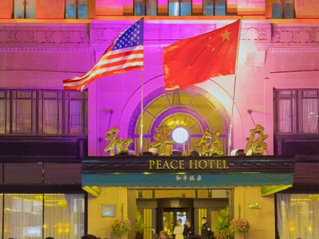 ▲布林肯下榻的上海和平飯店,中美國旗下大大的“和平”二字別有深意。