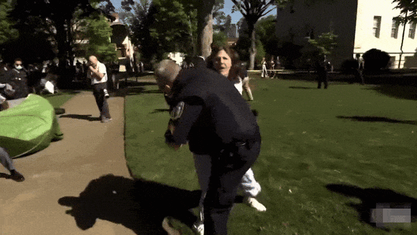 ▲2024年4月25日,美國亞特蘭大市****埃默裏大學一名經濟學教授因勸阻警方不要暴力逮捕支持巴勒斯坦的抗議學生而被警察擊倒在地。