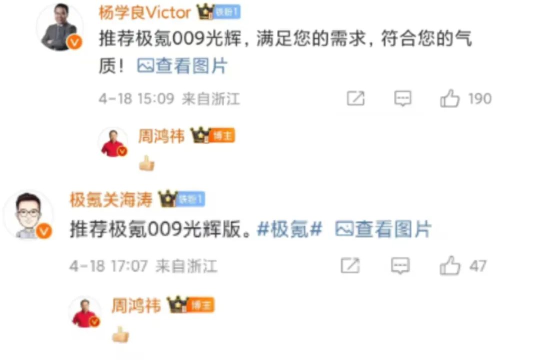 此前,周鴻禕在微博發帖公開要車之時,吉利控股集團高級副總裁楊學良、極氪智能科技CMO關海濤火速跑到評論區團建。