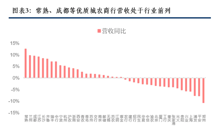 相比之下,一些地方經濟增長強過全國大盤,由此帶來城商行的增長機會。如經濟增長較快的江浙、成渝地區的城商行營收增長均處於行業前列。如下圖所示,常熟銀行、成都銀行、江蘇銀行、長沙銀行等依託區域經濟的發展,成為2023年前三季度營收增速最快的TOP5。