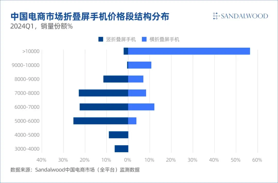 根據Sandalwood中國電商市場監測數據,2024年第一季度,摺疊屏手機在電商市場的銷量達到32萬台,月均銷量穩定在10萬台以上,同比增長33%。摺疊屏手機的銷售量和平均價格均呈上升趨勢。具體來看,橫折疊屏手機的平均售價達到1.1萬元,主要銷售區間集中在萬元以上。豎摺疊屏手機的平均售價超過7000元,銷售主力區間位於5000至8000元之間。從價格區間滲透率來看,摺疊屏手機在萬元以上市場的佔比達到17%,在6000元以上市場的佔比則為5%。隨着消費者對摺疊屏手機認知度的顯著提高,摺疊屏手機正在進入一個穩步成長的階段,正逐漸成為高端市場的重要組成部分。