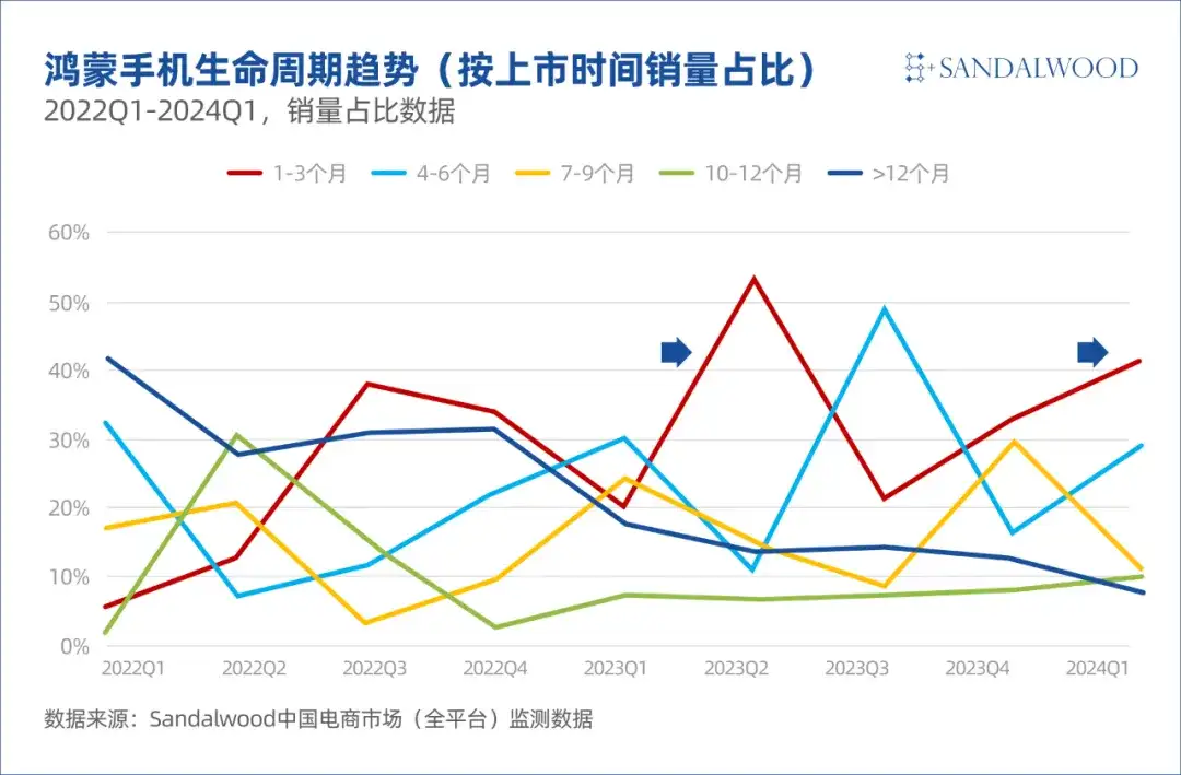 隨着華為在產品力方面的持續回升,鴻蒙智能手機已從依賴長生命週期的延續階段,轉向新品的主動迭代階段。同時,整個安卓手機市場的產品生命週期迭代也在加速。