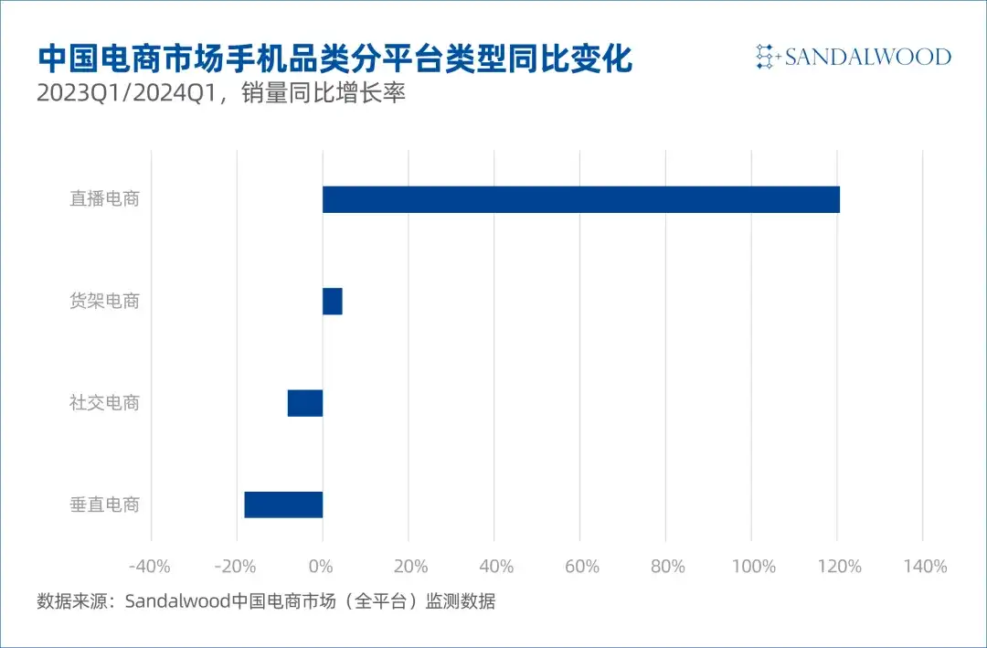 從電商業態來看,手機品類直播電商一季度銷量同比增長121%,貨架電商維持穩定,增長3%,社交電商和垂直電商分別同比下降 8%和16%。