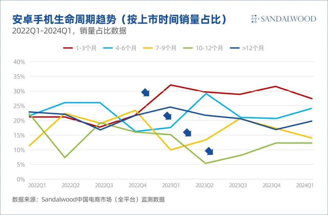 Sandalwood中國電商市場監測數據顯示,從2023Q1開始,安卓手機上市1-3個月的產品佔比持續提升,最高在30%,上市4-6個月的佔比相對波動,但也接近25%左右;7-12個月的產品佔比呈現逐步下降的趨勢。而12個月的佔比則保持在大約20%的水平。呈現出安卓產品加速迭代,新品上市初期(1-3個月)的黃金銷售階段越加重要。