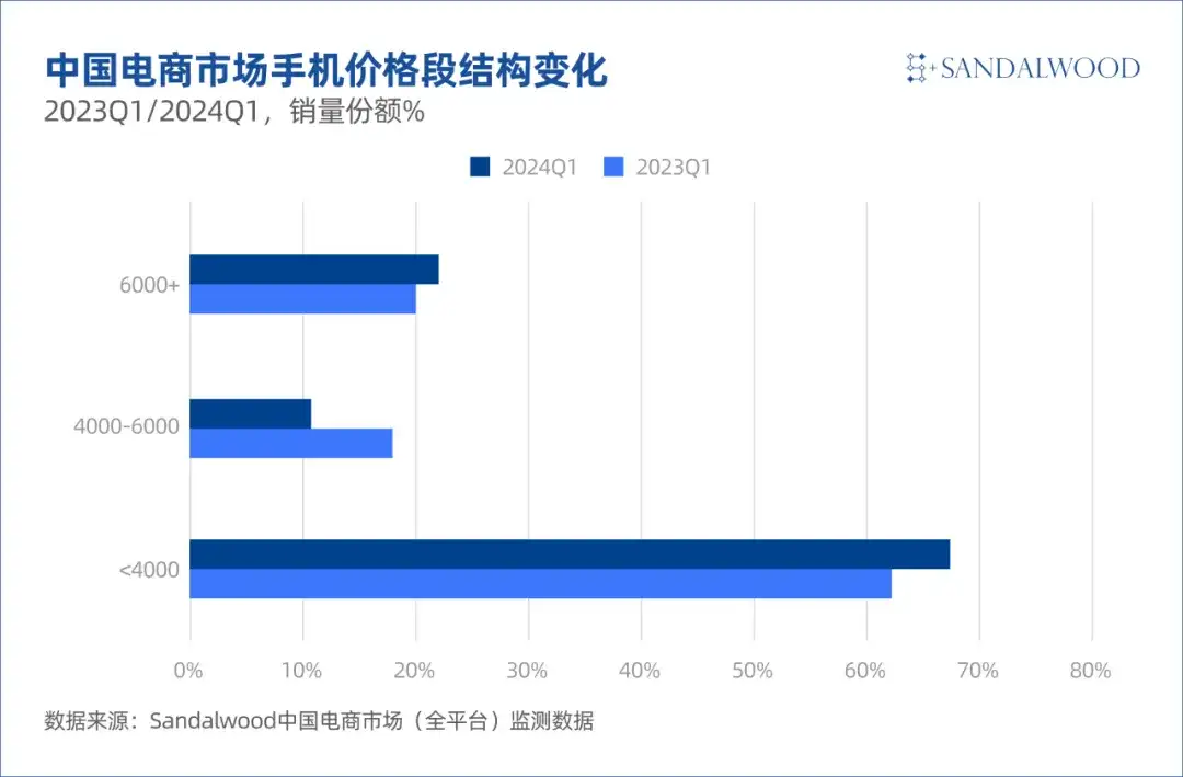 拆解到價位區間,2024年一季度,4000以下價格段市場佔比,從去年同期62%增長至67%,接近2021-2022年水平;4000-6000價格區間份額從18%下降至11%;6000以上價格段佔比從20%增長至22%,尤其1萬元以上價位佔比顯著提升。