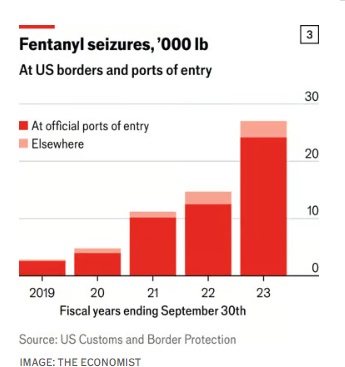2023年,美國查獲的芬太尼大約翻了一番,但目前還不清楚這是否意味着有更多的毒品越境,還是當局只是更善於發現這些毒品。美國海關與邊境保護局告訴《經濟學人》,兩個因素都有。