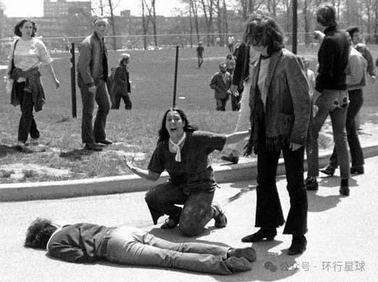 **僅五天後,俄亥俄州國民警衞隊在肯特州立大學向抗議學生開槍,造成四人死亡,九人受傷,**引發全國範圍的學生罷課。多所大學發生抗議、遊行、佔領教學樓、襲擊軍訓設施及與警察衝突等事件,導致97所校園停課。