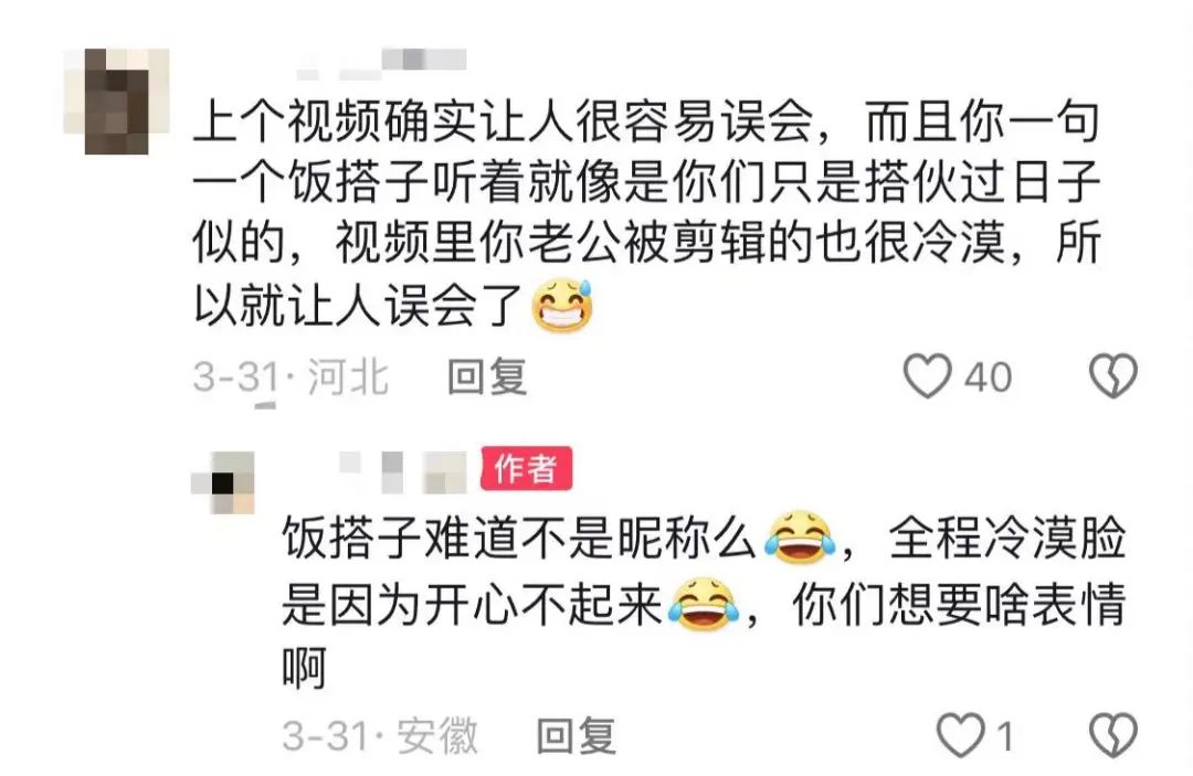 該博主一直稱老公為“飯搭子”,結果在一次記錄自己意外流產的視頻中,她又是一口一個“飯搭子”,加上男方當時的冷淡回應,讓網友誤會兩人婚姻狀態,紛紛為她打抱不平,吐槽男方的冷漠和不負責任。