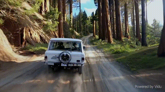讓它生成一段 “ 汽車加速駛過森林裏鄉間小路 ” 的視頻,像是樹林縫隙透過的陽光,後輪揚起的灰塵,都很符合咱們的日常認知。