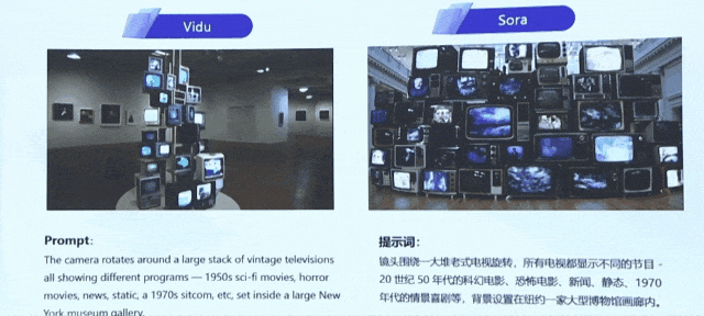 甚至在某些提示詞下, Vidu 的理解能力比 Sora 還強,比如 “ 鏡頭繞着電視旋轉 ” 的提示詞, Sora 壓根兒就沒 get 到旋轉的意思,反而是 Vidu 能輕鬆理解。