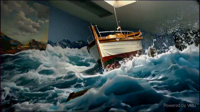 而且 Vidu 的想象力比咱人還要豐富,畫室裏的一艘船駛向鏡頭的場景,它分分鐘就能給 “ 拍 ” 出來,看這效果,不知道該有多少動效師瑟瑟發抖了。