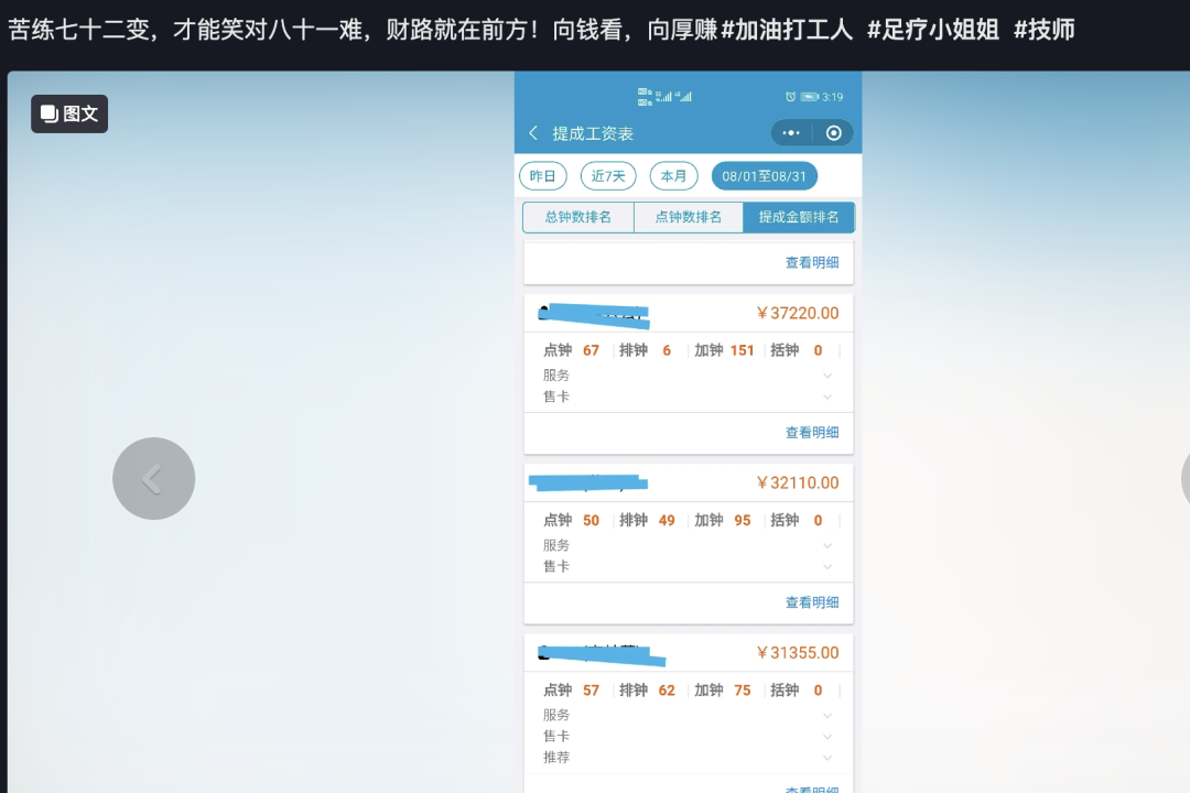 不僅快速地教會新人業務技巧,比如如何吸引客人加鍾等等問題。而且也大大削弱了傳統門店的力量,用“師門”取代“會所”,從原本的技師-會所-客户的鏈條,改造成 技師-師門-客户的鏈條模式。
