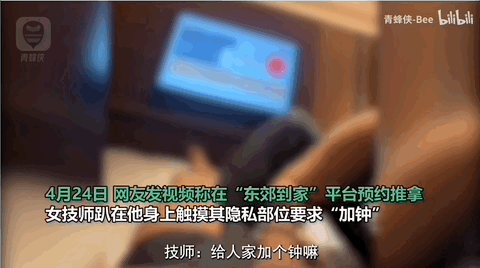 有的網友發視頻稱,東郊到家技師在基礎的按摩結束後,會觸摸其隱私部位,要求“加鍾”。