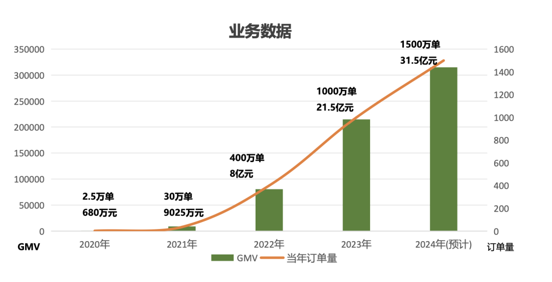 東郊到家的經營數據,十分亮眼,2023年GMV(商品交易總額)是21.5億元,同比增長接近150%,訂單量服務突破1000萬單,同比增長130%,平台用户也突破了1000萬人。入駐的商家達到了30000家。