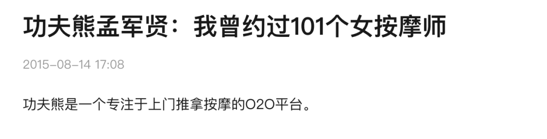 還有一個2015年,自稱約了101個女按摩師後,創業O2O平台“功夫熊”的孟軍賢。