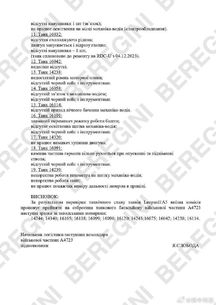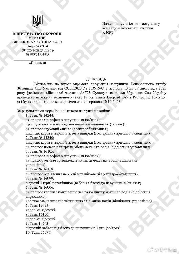 Beregini 組織的俄羅斯黑客發佈了烏克蘭軍方去年11月在波蘭接收Leopard 1A5坦克的報告。報告指出驗收的所有坦克,幾乎沒有任何一台能夠完全運行,其中只有16042沒問題。