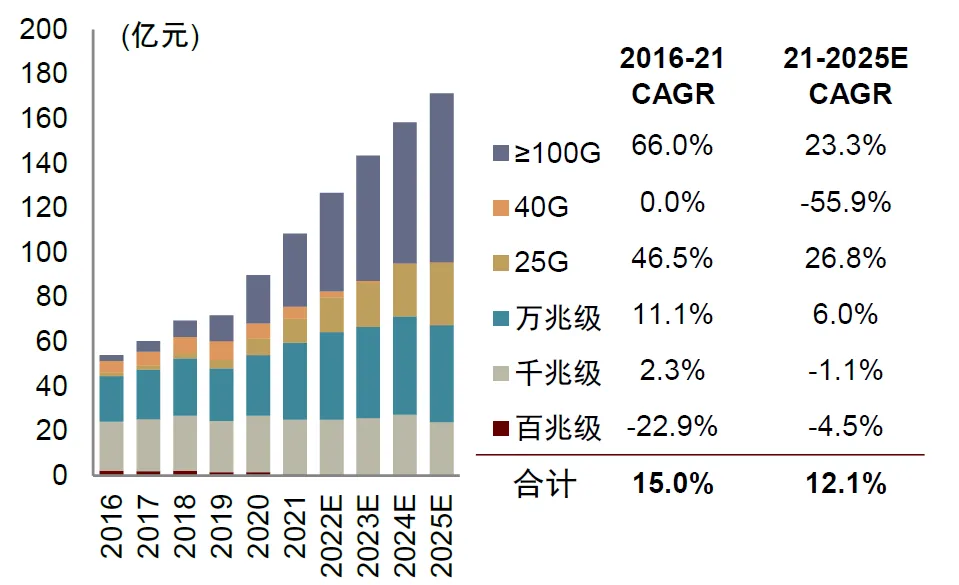 Dell’ Oro預計到2025年數據中心交換機市場規模有望超過200億美元,其中,根據Lightcounting預測,數據中心用高端交換芯片的市場規模則有望從2021年的2.7億美元增長至2025年的7.4億美元,**2021-2025年CAGR高達28.7%。**這一切得益於人工智能、數字化趨勢,數據中心發展勢頭較為強勁。