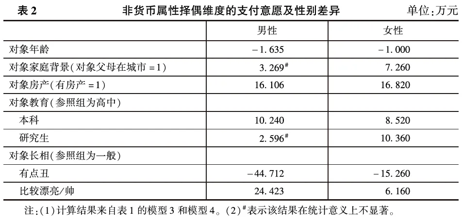 表2展示的是以虛擬人物年收入絕對數為基準進行標準化而計算的其他非貨幣屬性擇偶維度的支付意願,單位為萬元。**具體來講,男性對於比本人年長一歲的配偶年齡的支付意願是-1.635萬元,女性則是-1萬元。換言之,男女兩性均認為結婚對象比自己年長會給自己帶來負效用,需要結婚對象相應地在收入上進行彌補。**相比父母户口在農村,配偶的父母户口在城市對女性來説相當於配偶年收入增加7.26萬元,但對男性來説,配偶的父母户口在城市或農村的影響並不顯著。配偶若擁有房產,對男女兩性均具有較高的正向效用,相當於配偶年收入增加16萬左右。對於男性來説,配偶的本科學歷相當於女性年收入增加10.24萬元,但男性對女方研究生學歷的意願支付價格與高中學歷沒有顯著區別。對於女性羣體來説,研究發現當配偶的教育水平提高時,支付意願也隨之遞增,配偶擁有本科和研究生學歷分別相當於其年收入增加8.52萬和10.36萬。對於長相條件,一方面,男女兩性均表現出較高的支付意願,但男性對外貌的支付意願大大高於女性;另一方面,當從“一般長相”下降到“有點醜”時,男性和女性均表現出了極高的負向支付意願,而從“一般長相”上升到“比較漂亮/帥”時,意願支付價格的變化幅度則相對較小,這表明較差的外貌給人們帶來的負面效用顯著高於較好的外貌帶來的正面效用。