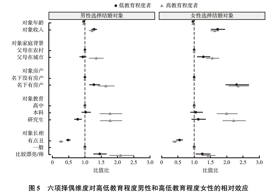 我們接下來考察對配偶教育特徵的偏好是否會分別在教育程度不同的男性羣體和女性羣體中存在顯著性差異。結果如圖5所示。在男性羣體中,相較於高中及以下學歷者,接受過高等教育的男性會顯著地期望女方也接受過高等教育。除此之外,接受過高等教育的男性對於女方的家庭背景、房產等其他社會經濟特徵的偏好也顯著更高。這表明,**與未受高等教育的男性相比,接受過高等教育的男性會顯著地提高自身的擇偶標準。****接受過高等教育的女性比未受高等教育的女性更加偏好接受過高等教育的男性,這一結果意味着女性羣體內部在擇偶偏好上也存在教育階層異質性。**接受過高等教育的男性和女性均偏好接受過高等教育的配偶這一結果突出了人們在擇偶時對教育特徵的同類匹配偏好。