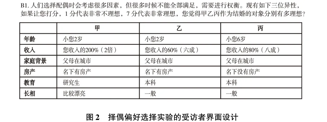 以往研究對於擇偶偏好的測量和解讀主要包括兩種方式。一種是列舉若干維度上(生理屬性、社會屬性、心理和品格屬性等)的指標,請受訪者對各種擇偶標準進行排序,或選擇其中最看重的幾項標準(徐安琪,2000;李煜、徐安琪,2004)。但擇偶偏好是一個組合型標準,人們會對各個維度上的偏好綜合評估擇偶給人們帶來的總效用。對擇偶偏好的列舉式測量難以反映不同維度的擇偶標準的相對效用或個體不同的特徵屬性在擇偶上的相對重要性。另一種方式是通過截面數據所觀察到的實際婚配分佈情況來間接推斷擇偶觀念及其變遷。既有研究發現,近年來同質婚在不同國家和社會中呈現上升趨勢(Dong & Xie,2022; Schwartz & Mare,2005),並據此推斷人們擇偶過程中同類匹配偏好上升。然而,這類研究的侷限性在於,實際觀測到的婚配模式只能針對已婚羣體進行分析,無法反映社會整體的擇偶偏好。更重要的是,實際擇偶行為未必等同於人們真實的擇偶偏好,因為實際的婚戀行為與婚姻建立還將受到由個人稟賦、婚姻市場和政策制度等結構性因素帶來的一系列主客觀條件的約束(Xie et al., 2015)。換言之,擇偶行為是一項深受機會結構限制的個體選擇,並不等同於主觀層面上的擇偶偏好。因此,對一個社會中擇偶偏好實際狀況的考察,需要建立在對擇偶偏好的直接且有效測量的基礎之上。