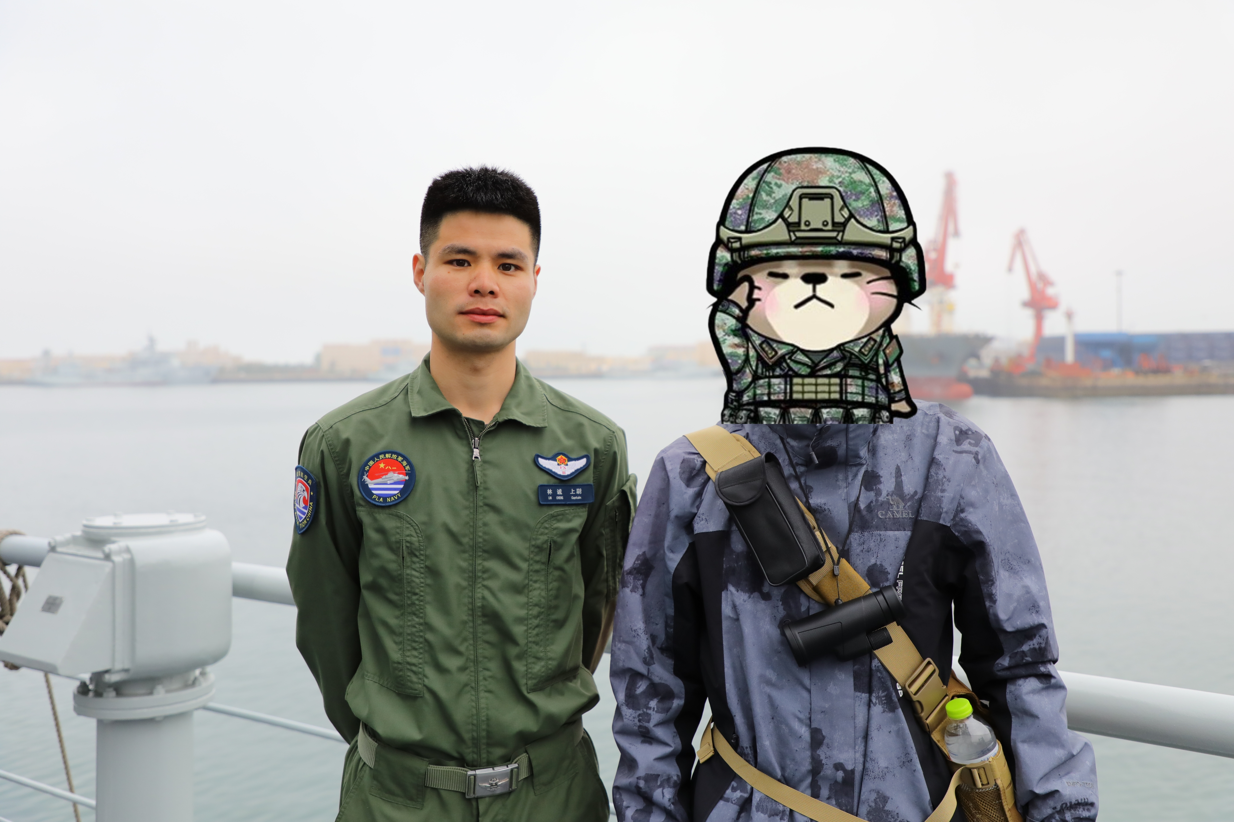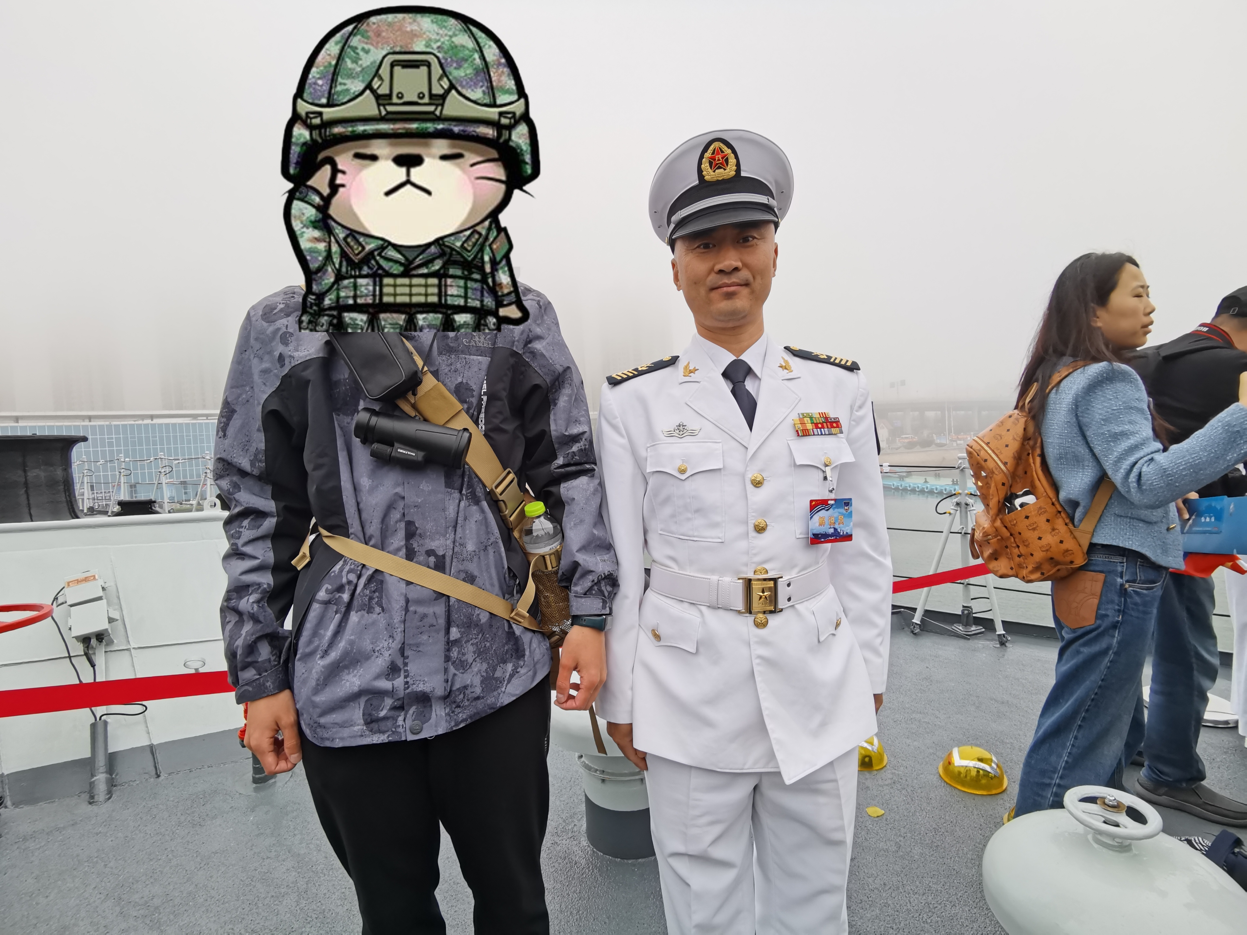 前甲板的人羣突然出現一陣騷動,所有人歡呼着往艦艏的方向擠去,似乎是有人在前甲板做直播,筆者只覺得那位頭髮花白的老人有些眼熟,便在沒人的地方找到了他的女同事合影——似乎前一天在海軍博物館有碰到過。等到老人完成了直播,鬼使神差之下發覺自己竟被人流擠到了最前面,也只能卻之不恭,拿起手機和老人自拍合影。大腦一片空白之下,筆者完全忘了自己身上就帶着紙和筆,沒能找他們要兩張簽名,直到狗羣主一臉興奮地穿過人羣向我們跑來……