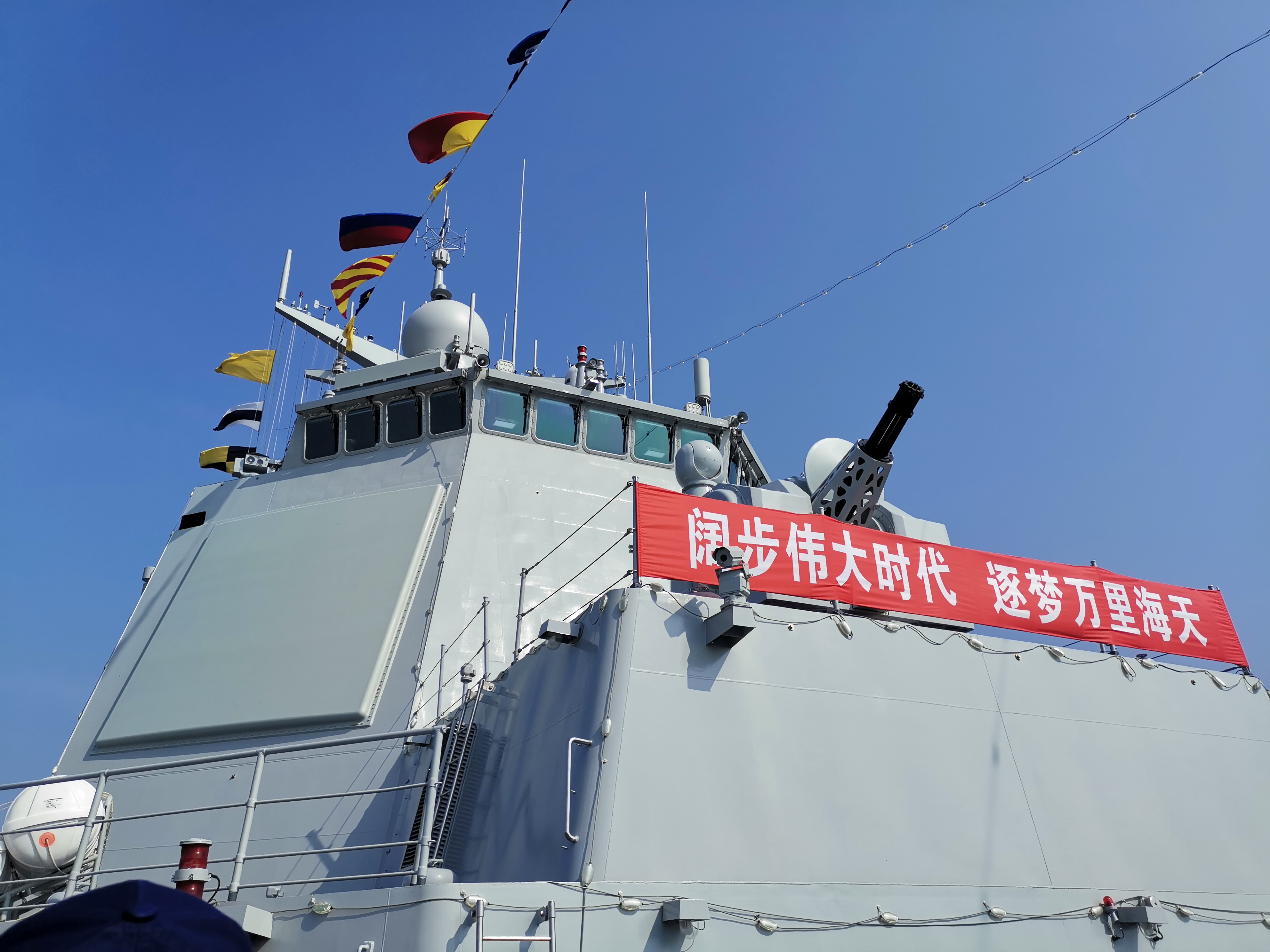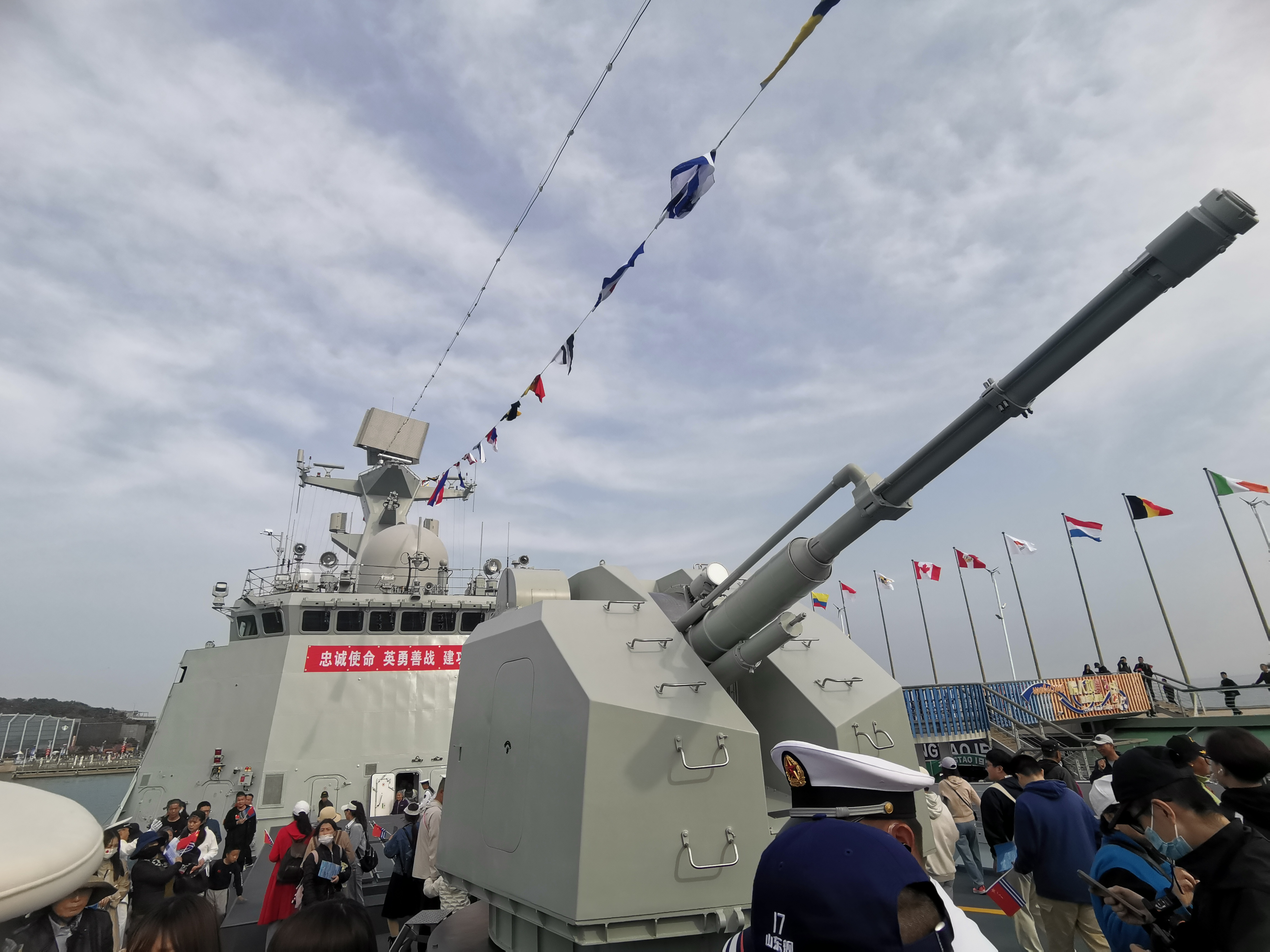 石家莊艦是這次參觀的重點。法制100炮,熊阱助降系統,高聳的30N6E1雷達,獨具特色的俄式轉輪垂髮,乃至這條船作為2009年海上閲兵艦的特殊地位,無不使我對它充滿了期待。安檢一過,便自恃年輕力壯,只帶了一個挎包,大吼一聲,撲向石家莊艦。轉頭一看,空軍大哥左手拿着佳能單反,右手拿着大疆ACTION4和全尺寸自拍杆,還揹着存放長焦鏡頭的雙肩包,竟迅速趕了上來,邊跑邊和一旁的糾察打趣“體能沒白練,空勤灶沒白吃”。在碼頭上,我們用盡長槍短炮,對着頂板和30N6E1一頓招呼。飛奔上艦,穿越過道,儘管這條渤海地空導彈營有着滿滿的急就章和妥協意味,但一塵不染的甲板和光亮如新的艦體,乃至整齊佈置的管線和隨處可見的損管設施,依然能讓人感受到“愛護軍艦像愛護自己的眼睛一樣”。前甲板上,面對一人多高的B炮位,我只得單手把手機盡力舉過頭頂,奮力一躍,勉強一睹裏夫M左輪垂髮的真容……