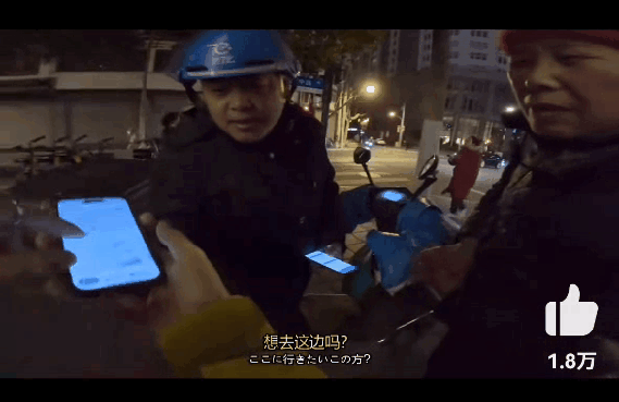 在日本夫妻的視頻裏,他們想找旅館,一個上海大媽很熱心拉着他們去找,半路遇到開電瓶車的外賣騎手幫忙指路,四人攀談了起來。