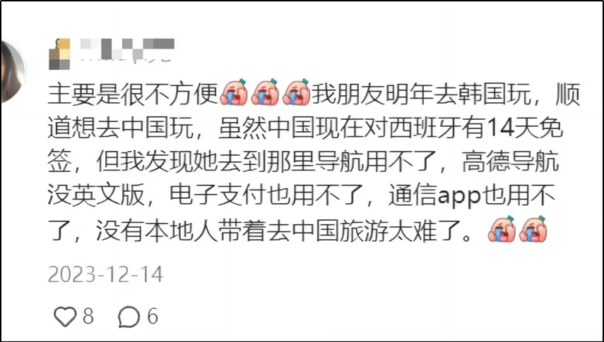 電子支付用不了,高德地圖沒有英文版,通信APP用不了,沒有本地人帶着去中國玩會舉步維艱。