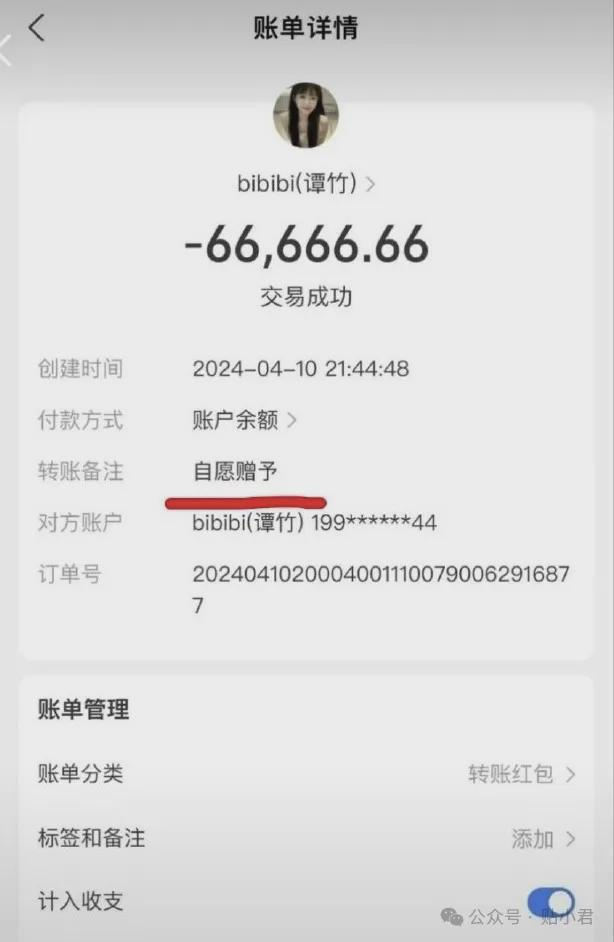2024年4月10日白天,胖貓還在各個接單羣裏瘋狂接單,然後在晚上給小檀轉了最後一筆錢66666,上面備註了「自願贈予」。