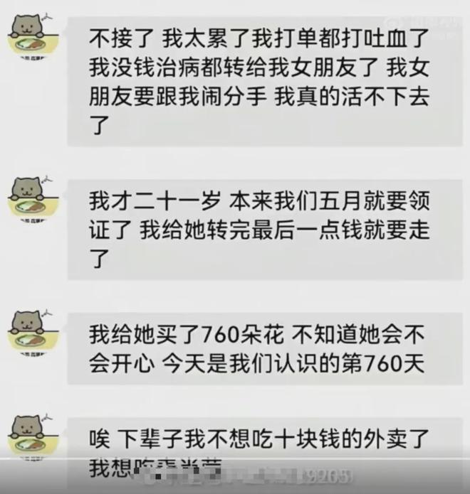 4月11日凌晨2點,他們再次説了分手;凌晨3點26,他下單了一束玫瑰,780塊,送給小檀。他最後留在人世間的話,是 我下輩子不想吃十塊錢的外賣了,我想吃麥當勞 。