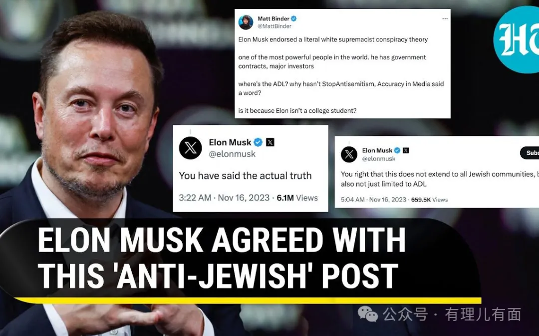 2023年5月,美國知名企業家、億萬富豪馬斯克,在網上將金融大鱷喬治·索羅斯比作影視反派“萬磁王”後,以色列外交部指控其言論“侮辱猶太人”,自此陷入“反猶風波”,其中反反覆覆,一會指責馬斯克本人言論反猶,一會又指責其實控平台X(推特)反猶,之後蘋果、IBM、迪士尼等紛紛暫停對X的廣告投放,之後又遭遇白宮和CNN等媒體的譴責。2024年1月,馬斯克再也頂不住壓力,攜子前往波蘭奧斯威辛集中營“接受教育”,其間他點燃了一支蠟燭,以紀念在納粹大屠殺中被害的數百萬猶太人。參觀過程中,馬斯克坦言,自己此前對X上反猶太主義的看法“天真”,同時聲稱:從某種意義上説他自己也是猶太人,他的朋友中有2/3都是猶太人,而在他的朋友圈裏,反猶太主義很少被談論。