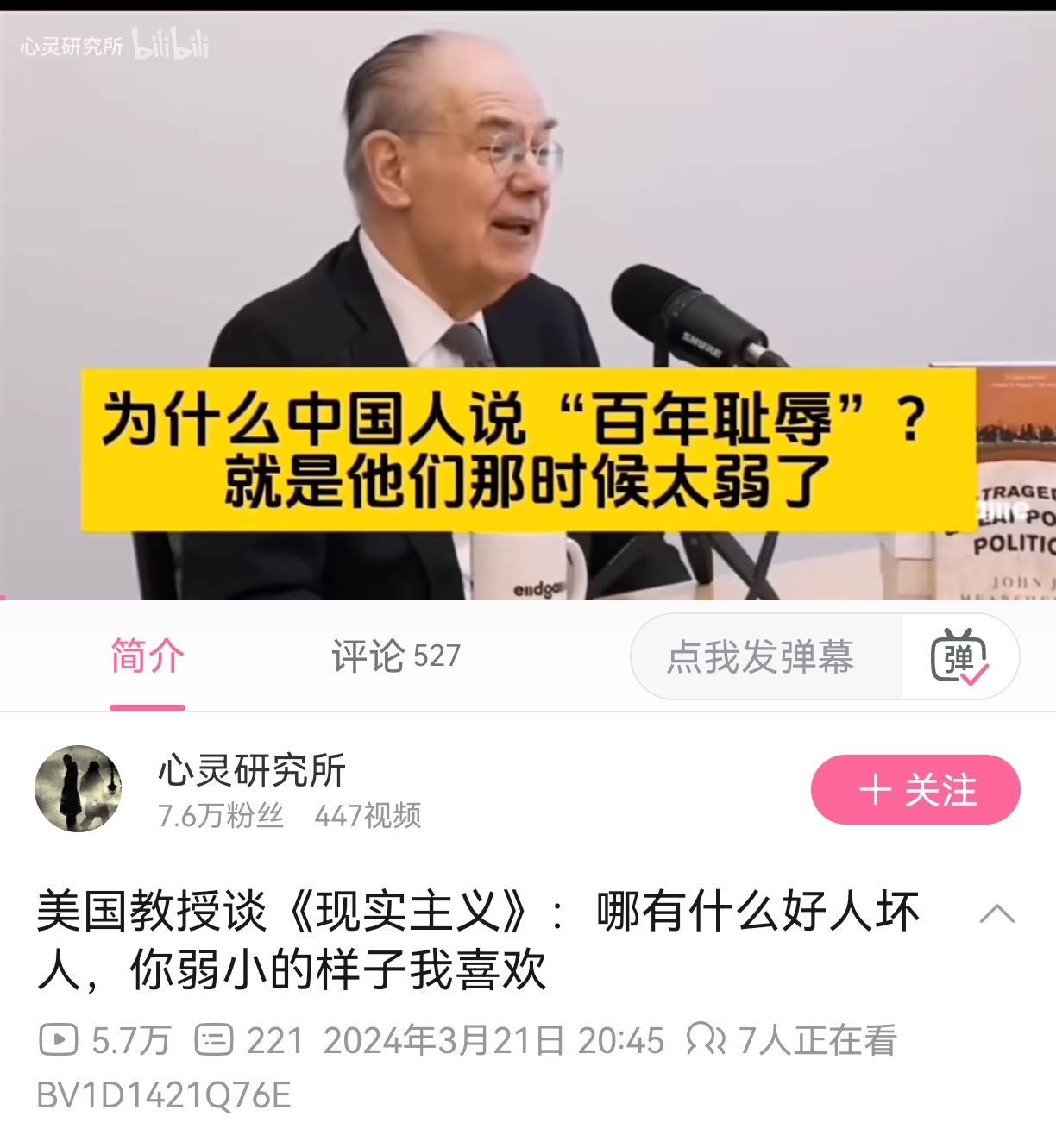 我並不真正瞭解他的現實主義思想,僅從表面而言,他似乎強調的還是自己強大、別人弱小,然後強大的力量成為霸權,支配某一個地區。他覺得如果中國人相信和平崛起,就代表中國人太幼稚太天真等等。