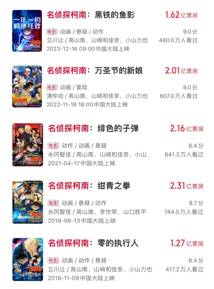 前年《航海王:紅髮歌姬》拿到近2億票房;一年一部《名偵探柯南》,票房都穩定在1.5-3億。