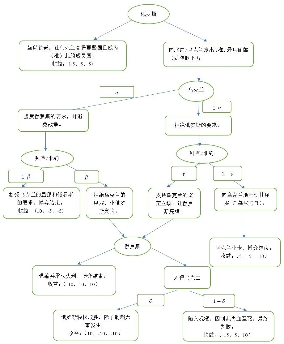 他提出了一個簡單模型,推演出俄羅斯出兵的必然性。因為不出兵博弈獲得利益,很可能遠遠小於出兵博弈帶來的利益。