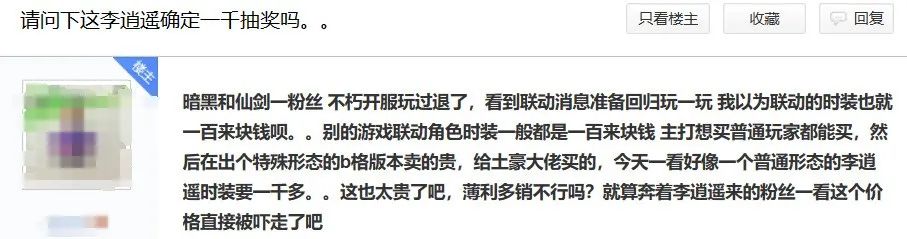 遊戲貼吧討論裏,玩家們對於“逍遙劍仙”套裝給出的差評遠比好評多,認為這套時裝“太醜”、“不值得花上千元抽”,相較之下基於反派角色拜月教主設計的 “拜月密使”由於只需百元左右就能獲取,更受玩家歡迎。