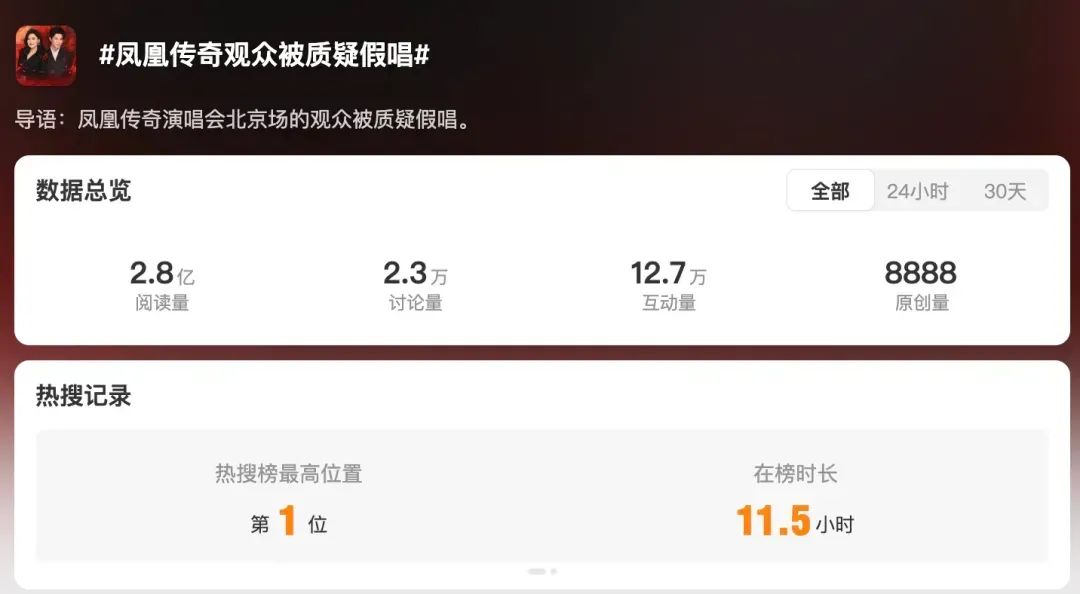 5月6日抖音娛樂榜第一的消息是**“第一次見闢謠觀眾沒假唱的”**。原因是鳳凰傳奇在常州和北京鳥巢先後舉辦兩場演唱會,其中鳥巢演唱會被認為合唱聲音不夠震撼,聲音太小。