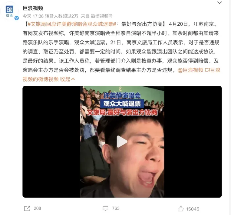 4月20日,許美靜南京場的演出現場,近2個小時的演出時間,許美靜本人實際演唱的時間加起來不足半小時。此舉引發粉絲的不滿,集體喊話主辦方“退票”。