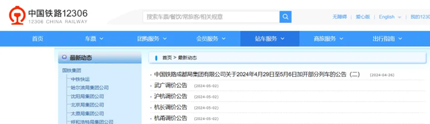 5月2日,鐵路12306官網發佈四則調價公告,對京廣高鐵武廣段、滬昆高鐵滬杭段、滬昆高鐵杭長段、杭深鐵路杭甬段上運行的時速300公里及以上動車組列車公佈票價進行優化調整,將從2024年6月15日起實施。