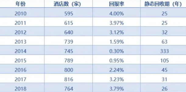 其二,縣城旅遊火熱之下,極其考驗縣城的遊客接待能力。一方面,國家旅遊局相關數據顯示,2010年至2018年期間,國內五星酒店回報率最高的是2010年,靜態回收週期長達25年。最低的為2014年的0.3%,需要333年才能回本。