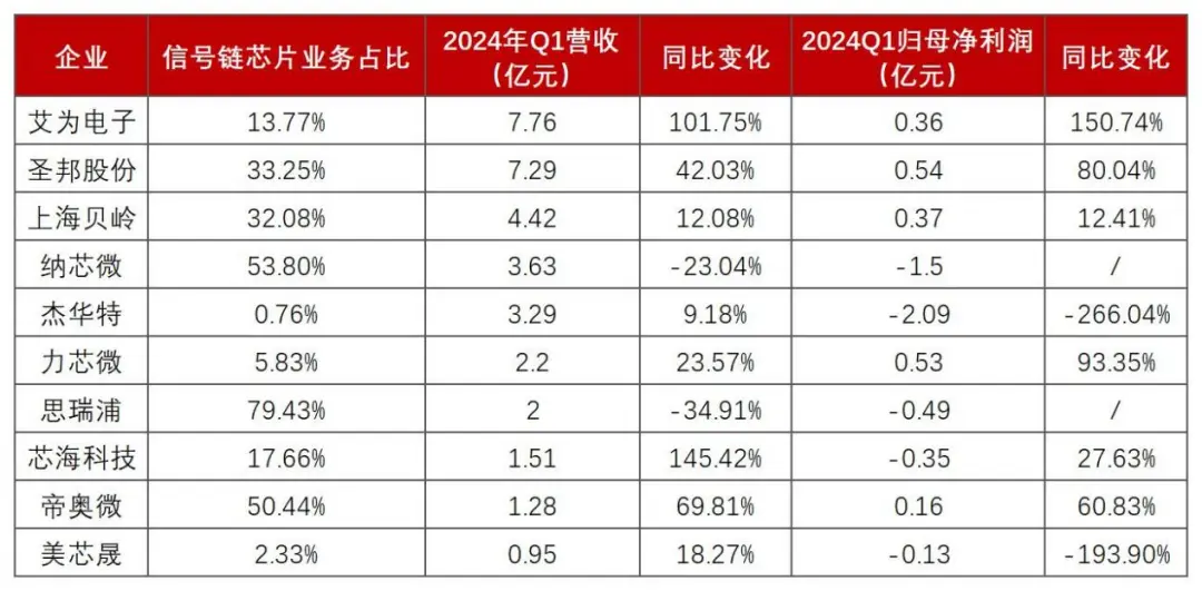 最新報告顯示,2024年一季度以信號鏈芯片為營收大頭的納芯微、思瑞浦營收仍出現負增長,且淨利也均處於虧損。納芯微一季度收入3.63億元,同比減少23.04%;淨利潤虧損1.5億元。思瑞浦一季度收入2億元,同比減少34.91%;淨利潤虧損0.49億元。