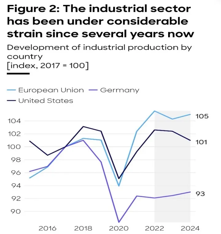 |德國工業產值增長率近十年來一直低於歐盟平均水平,來源:羅蘭貝格、德國工業聯合會等