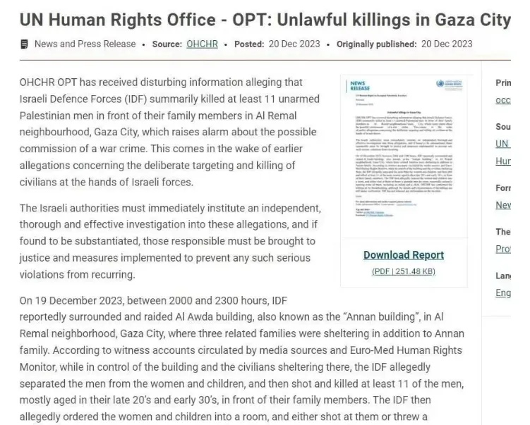 他們在攻入加沙後不斷實施殘忍的屠殺,聯合國人權機構在去年12月20日公佈的相關資料證實:以色列國防軍的內扎·耶胡達部隊在進入加沙後對難民實施屠殺,其中包括將男性當着妻兒的面屠殺,然後將婦女、兒童鎖進房間內,再投擲手榴彈屠殺!