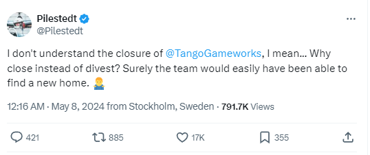 Arkane Lyon(開發過《死亡循環》)的負責人Dinga Bakaba,就在得到消息後的表現有些“破防”——他在社交媒體上表示強烈不滿,希望高層們能看到自己的感受。